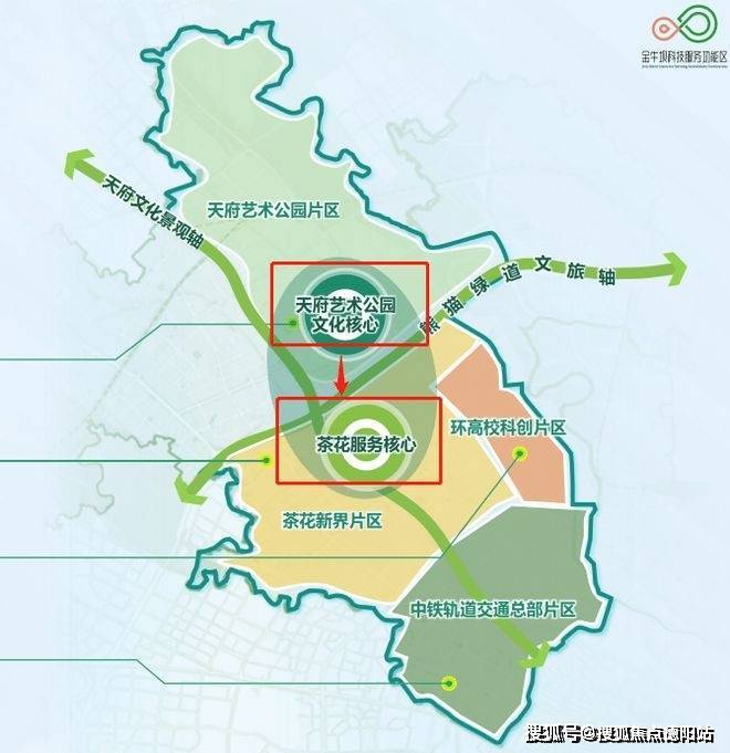 天府艺术公园片区:打造代表四川开放新高度的“一带一路”对外交往中心,规划面积12.6k㎡,以金牛国宾馆和天府艺术公园为核心建设扬天府神韵、放金牛异彩的”蜀都之窗“。