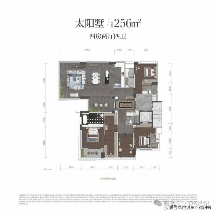 ⚜256㎡太阳墅(城西最大面积大平层):270°环幕视野 “环幕全景舱”户型,约21米采光面,LDKB约80㎡+带空中院子(约15㎡),三个套卧设计+老人房相对独立,三个卧室朝南,主卧套房约58㎡,四卫设计