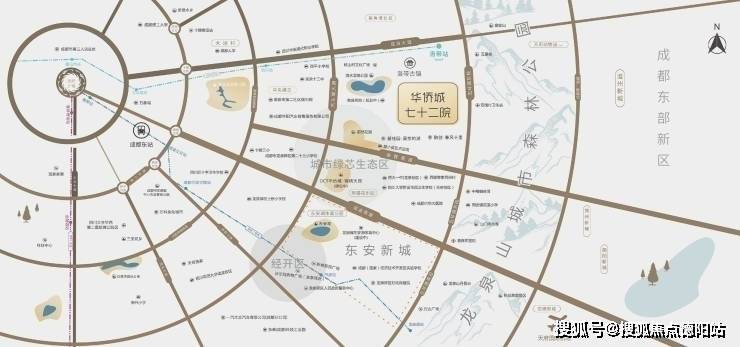洛带华侨城·七十二院,东靠龙泉山城市森林公园,北接国家4A级景区洛带古镇,西面洛水湿地公园,南临千亩蔚然花海