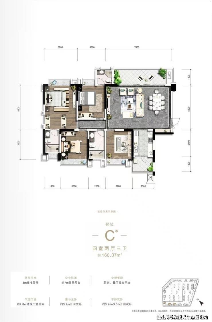 面积160㎡左右套四三卫、双主卧设计,港式大横厅,客厅长7.8m,宽5.3m,横厅设计,并连带约7m长*宽1.8m的观景阳台,大尺度厅堂超越平凡.
