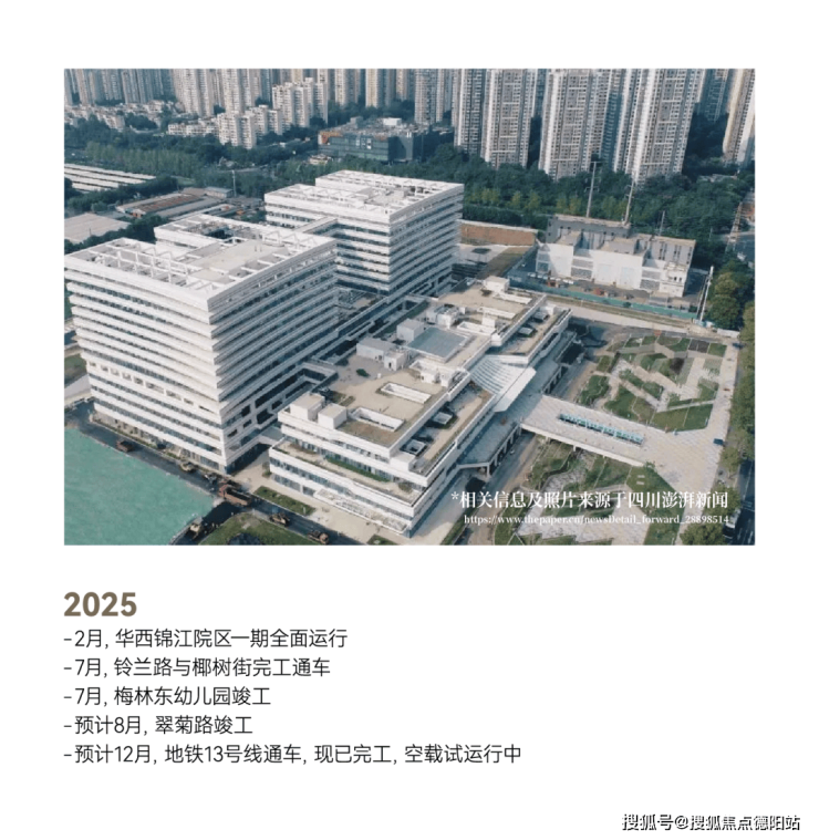 •「陆轨空并济」交通体系,外部道路纵横且高效链接双国际机场,三轨交织——地铁13号线一期(计划年底前运营)与9号线二期(规划)在“岛”内设置两个站点(梅香湖站、三圣花乡站),其中三圣花乡站将是双线换乘站点。此外,板块周边还坐拥全城罕见的三大TOD,内部路网也即将全面完工。