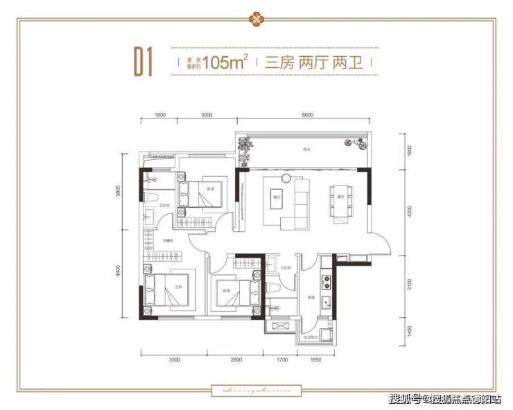 D1户型 约105㎡ 三室两厅双卫双阳台