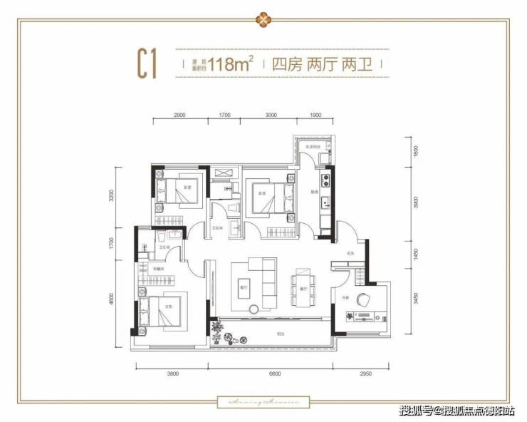 C1户型 约118㎡ 四室两厅双卫双阳台