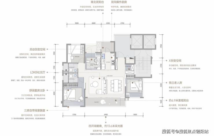 【LDKB社交厅】约6.9米大面宽客餐厅与厨房、阳台无界连通