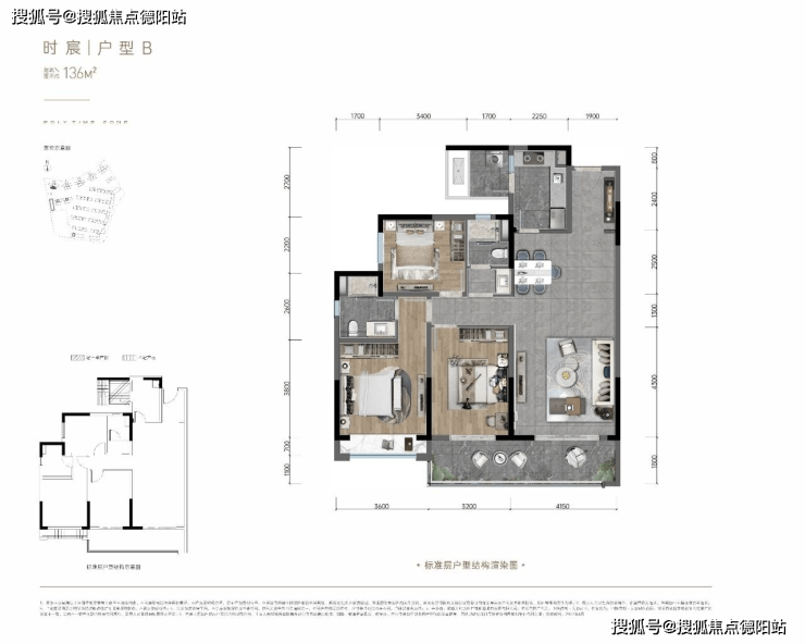 户型B:136平米,套三双卫,传统竖厅,客厅4.15米开间,7.35米大阳台,朝南