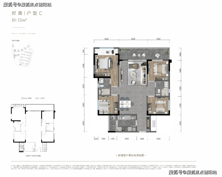 户型C:136平米,四室两厅两卫,传统竖厅,客厅4.2米开间,7.4米大阳台,三面采光