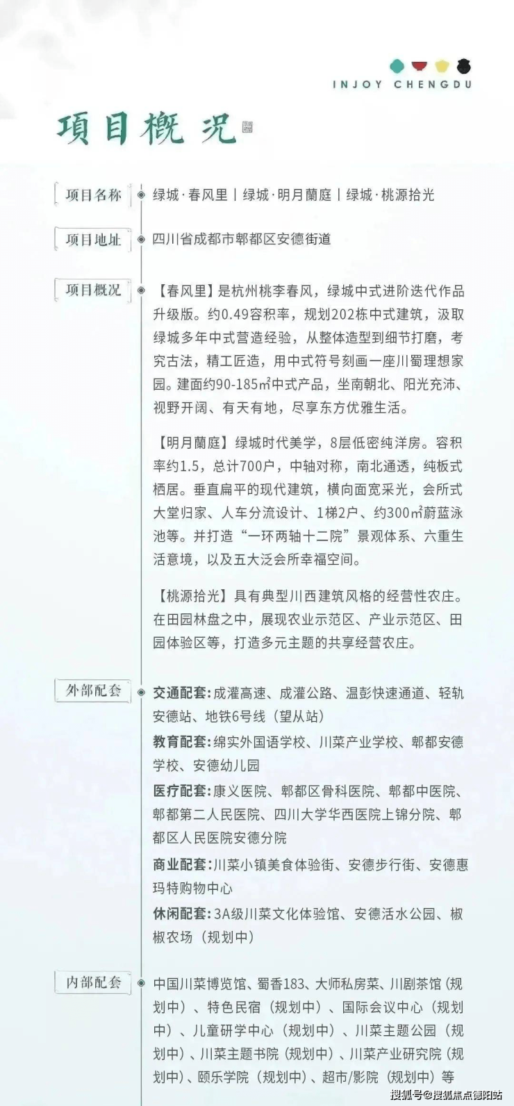 绿城·川菜小镇位于大城西郫都区,紧邻成灌公路、成灌高速与第二绕城高速,距成都天府广场35公里,属成都市“半经济圈”范围。小镇总占地约10847亩,围绕“川菜文化”与“现代都市田园”两大IP,以两轴、六心、六区为总体规划,囊括小镇商街、中式产品、川西林盘、田园农场、主题民宿等多种业态,打造集“文旅、田园、休闲、康养、教育、宜业、宜居”于一体的川蜀理想生活小镇 。