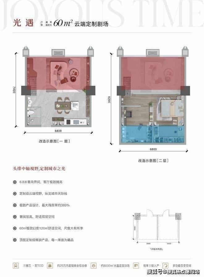 3、舒居产品:8000㎡超大空中花园,三重归家入户(-2F地铁光厅入户、双首层入户、空中花园入户),户型超大赠送,30㎡舒居套二,使用面积高达57平,空间感十足。