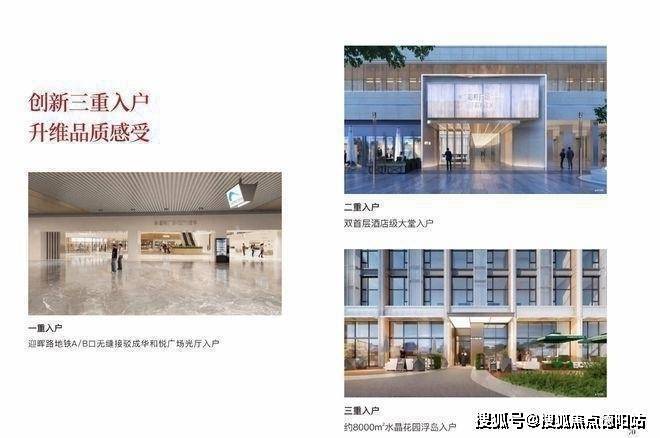 4、一站式消费新地标,7号线无缝链接 满足区域内年轻客群生活所需的24小时悦活主场。 创新三重入户 一重入户:迎晖路地铁A/B口,无缝接驳光厅入户。 二重入户:双首层酒店级大堂入户。 三重入户:约8000㎡水晶花园浮岛入户。