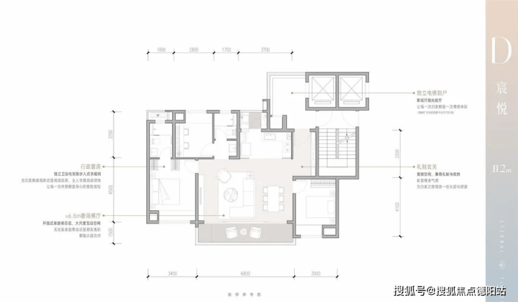 约6.8m奢阔横厅开间,开放式家庭核芯区,大尺度互动空间