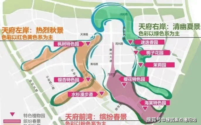 其中天府前湾将以粉色系为主,布局200亩樱花特色园、60亩海棠特色园;天府左岸以红黄色系为主,40亩银杏特色园、25亩枫林特色园、3公里水杉漫步道;天府右岸以绿色为主,茉莉园、栀子花园、迷迭香园。万亩绿肺环伺,实现真正的公园城市生活