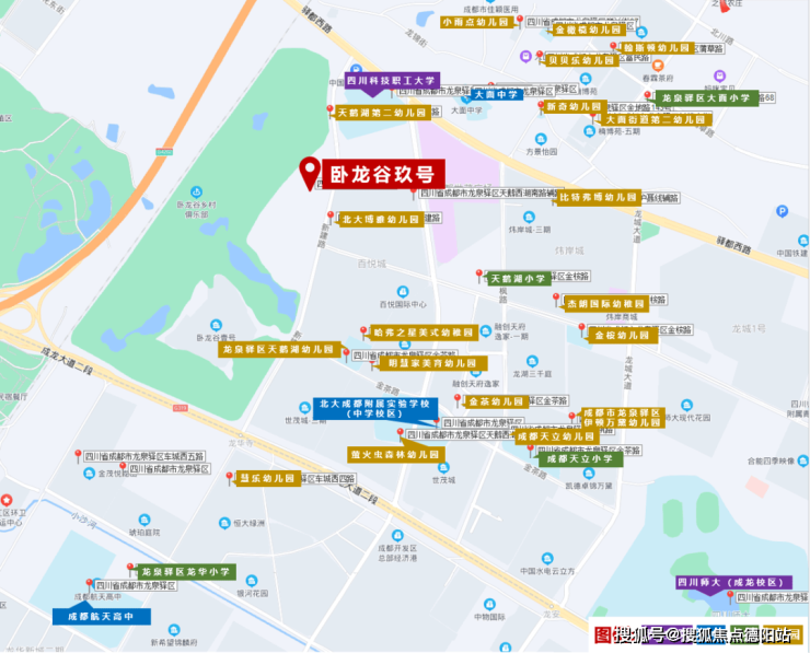 卧龙谷玖号位于龙泉新建路,距地铁2号线行政学院约2公里,周边城市界面新,配套成熟。从区域来看,它更靠近绕城高速,毗邻三圣乡,位在成龙大道与驿都大道围合区域内。