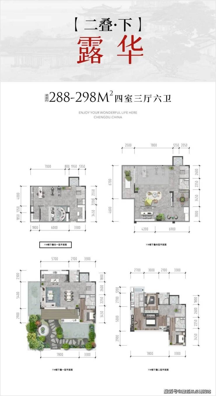 双叠共4栋:上249-265㎡(天钧),下288-298㎡(露华)。