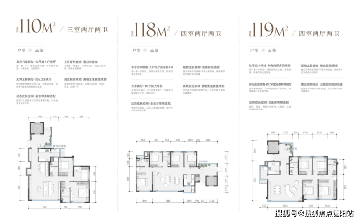 其中仅110㎡户型为套三双卫,其余全部为套四户型。