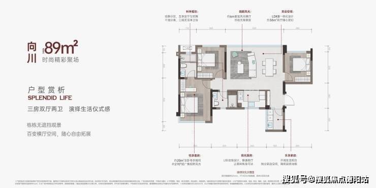 创新设计:LDK-R一体化方厅(餐客厨一体)+约6米双面宽阳台,增强家庭互动;