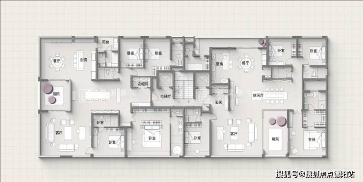 290㎡户型为2T2,同样是4.5房3厅5卫,每户设计了近20㎡的空中庭院,客厅、休闲厅、餐厅组合设计,超130㎡公区活动空间彰显豪宅尺度。