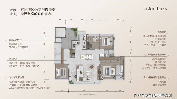户型亮点:约99%超高得房率,143㎡的面积,悦享180㎡的尺度,约15米朝南采光面,光感无界奢享;约56㎡的大方厅,幻变多功能空间,舒展丰富场景