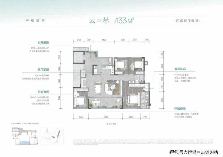 项目占地约17亩,容积率仅2.0,规划了4栋15-17F的小高层,均为2T2户设计。4栋建筑整体呈L型排布,均无对视,且打造出一个东西向的中庭。据悉,项目打造了包括沉光水吧、静谧下沉书吧、森系童享乐园、私享健身室、欢聚家庭聚会区、活力台球室、私享茶室七大功能的会所,产品则涵盖了建面约112-133㎡的全四房户型。
