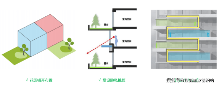 通过花园的上下错层和平面错开布置,通过增设隐私挑板,造型遮挡墙等方式,让此超四代宅实现了更好的隐私保护