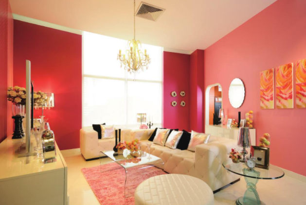 用红色表现主体气氛,将其放在沙发墙上,占据视线中心点。玫红色的墙面很好地衬托了碎花沙发布艺沙发,令整个客厅空间更加娇媚。