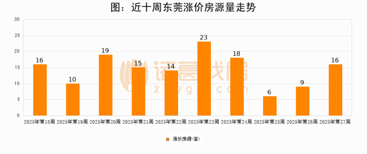 从调价房源来看,第27周东莞涨价房源16套,较上周上涨77.8%。与此同时,27周涨价房源占比提升2.32个百分点,业主信心持续恢复。