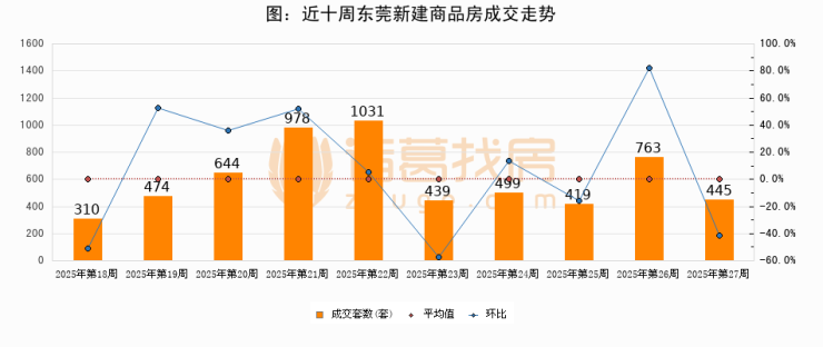 进入2025年第27周(06月30日-07月06日),东莞新建商品房成交445套,较上周减少318套,环比下降41.7%。从近十周成交来看,周均成交套数为600套,本周成交445套,低于近十周平均成交量25.8%。