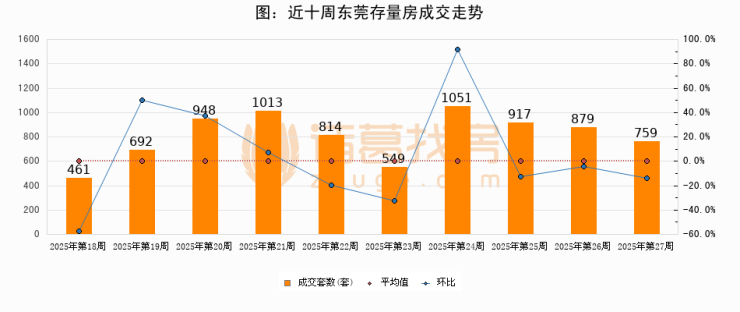存量房方面,第27周东莞存量房成交759套,较上周减少120套,环比下降13.7%。从近十周成交走势来看,周均成交套数为808套,本周低于平均水平6.1%。