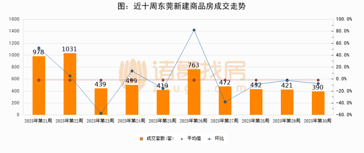 进入2025年第30周(07月21日-07月27日),东莞新建商品房成交390套,较上周减少31套,环比下降7.4%。从近十周成交来看,周均成交套数为584套,本周成交390套,低于近十周平均成交量33.2%。
