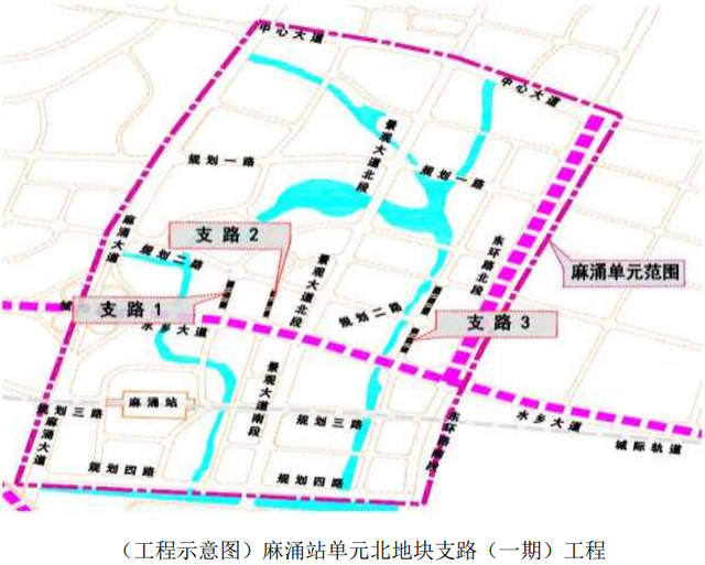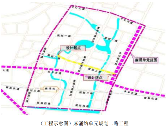 本次建设规模包括6条市政道路、2座桥梁,道路总长度约2.45km,宽度18~30m,较高设计速度为40km/h,政府投资金额为2.2亿元。