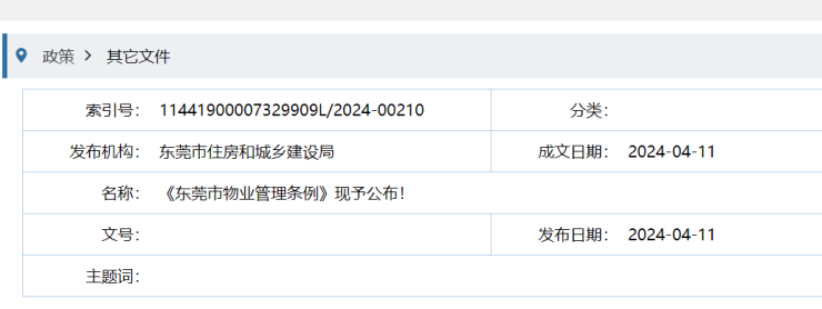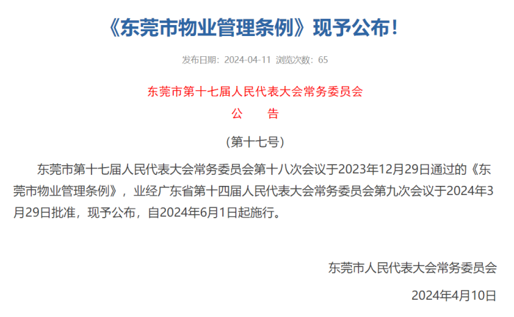公告显示,“东莞市第十七届人民代表大会常务委员会第十八次会议于2023年12月29日通过的《东莞市物业管理条例》,业经广东省第十四届人民代表大会常务委员会第九次会议于2024年3月29日批准,现予公布,自2024年6月1日起施行。”