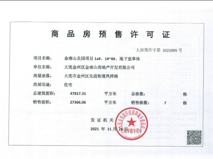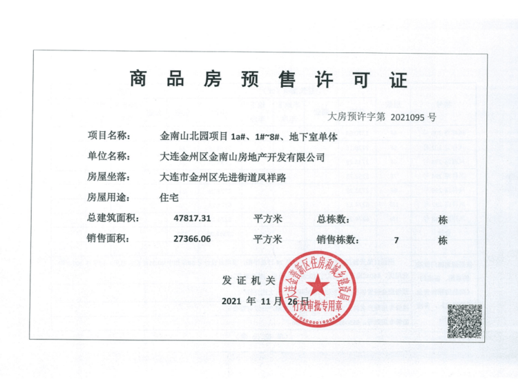 - 大房预许字第2021095号 详情发证时间 2021-11-26绑定楼栋凤祥路288号(7号楼),凤祥路300号(1a号楼),凤祥路292号(5号楼),凤祥路294号(3号楼),凤祥路302号(1号楼)
