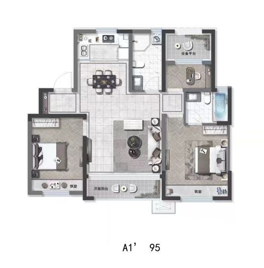 3室2厅2卫-A1'户型,3室2厅2卫 ,95平米