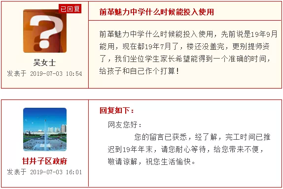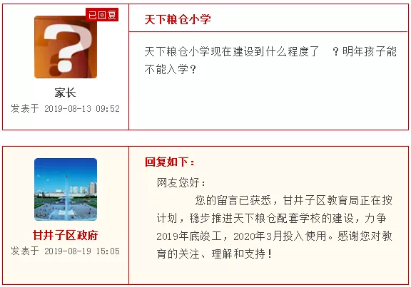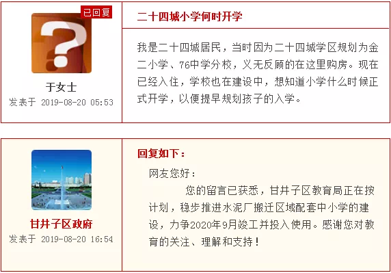 “以前听说金地檀境、金地自在城周边将规划中小学,现在又听说只有小学没有中学,想得到一个确切的答复。若有,何时开工建设?”近日,市民小麦和市民刘阳相继在民意网上咨询。
