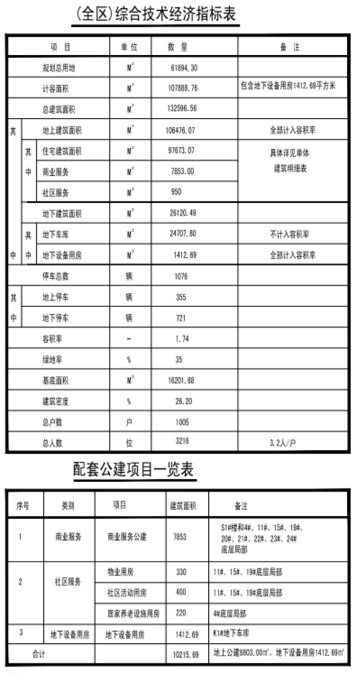 配套公建项目方面,包括商业服务、社区服务、地下设备用房等三类,其中商业服务公建建筑面积为7853平方米,物业用房建筑面积为330平方米,社区活动用房建筑面积为400平方米,居家养老设施用房建筑面积为为220平方米,地下设备用房建筑面积为1412.69平方米。