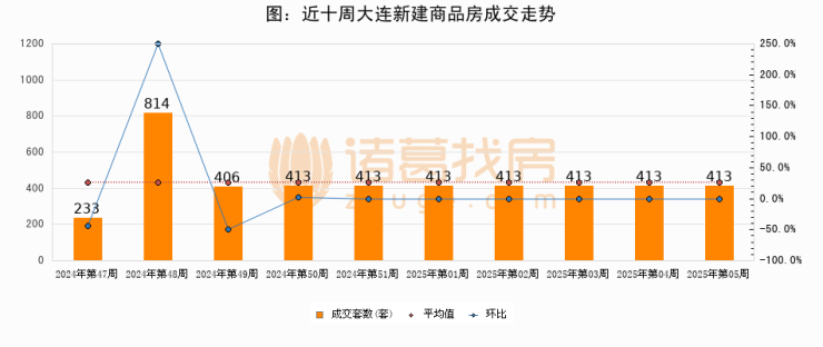 进入2025年第05周(01月27日-02月02日),大连新建商品房成交413套,较上周持平。从近十周成交来看,周均成交套数为434套,本周成交413套,低于近十周平均成交量4.8%。