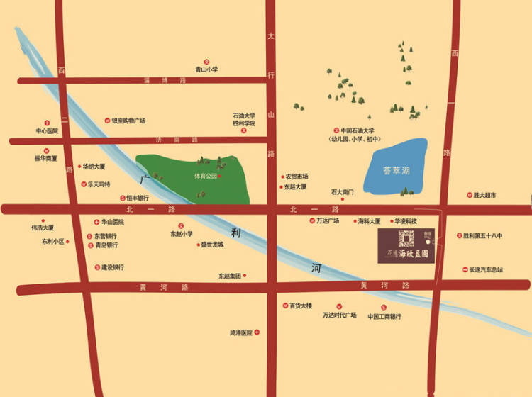 项目位于东营市西城区西一路与北一路交汇处,东临西一路、南接黄河路(顺河路)、 西邻千佛山路、北邻北一路。西一路是城市中心的中轴路,黄河路、 北一路是连接东西城的主干路,该区域属于东营市的正中央位置。项目南靠广利河湿地公园,北接荟翠湖、体育公园等娱乐配套。同时与万达商圈仅一路之隔、距离百大、银座商圈仅3公里,购物休闲娱乐咫尺之遥。不仅如此社区内部自身配有两层商业,为生活提供更加方便的配套设施。油田中心医院、鸿港医院、八局医院等距离本项目 10 分钟车程,为我们的生活保驾护航,中国四大银行及光大、民生、交通、招商、中信银行等金融系统也近在咫尺。浓厚的商业氛围,让你在繁华中体验无限尊贵。
