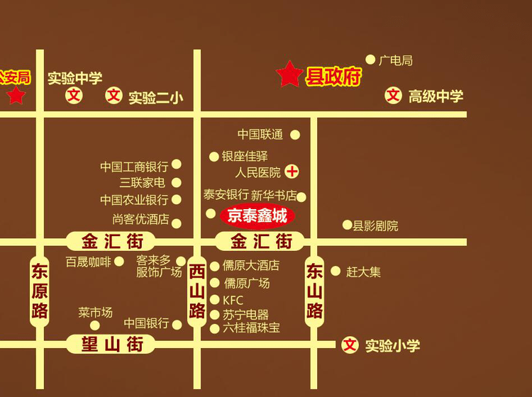 紧邻东平县金汇商业步行街及西山路商业街,周边一实小、二实小、实验中学、高级中学、人民医院、儒原大酒店、儒原百货、电影院等公共配套齐全