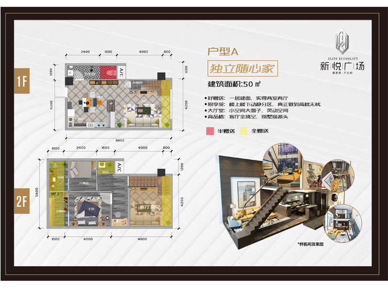 普通平层公寓面积为50㎡的户型,1厅1卫,得房率一般在60%-70%左右。而同样是50㎡的益众新悦广场LOFT公寓二层扩展面积会增加一倍,户型增加为2室2厅1厨1卫,得房率可以达到100%。