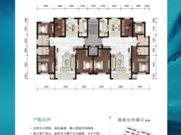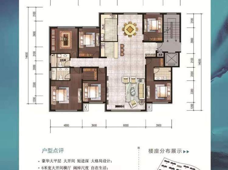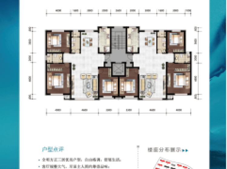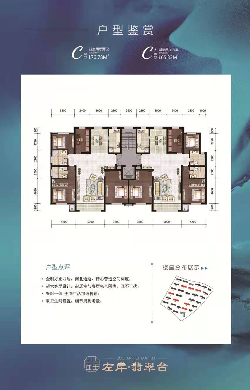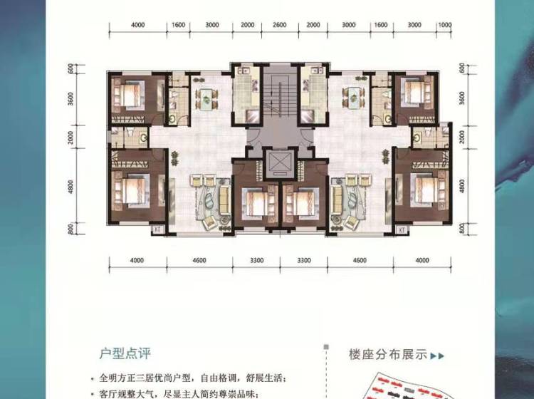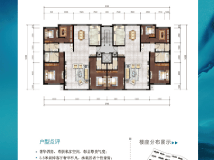 面积从102—300平米,全落地阳台保证充足的采光与视野;大开间、短进深,户型方正实用。