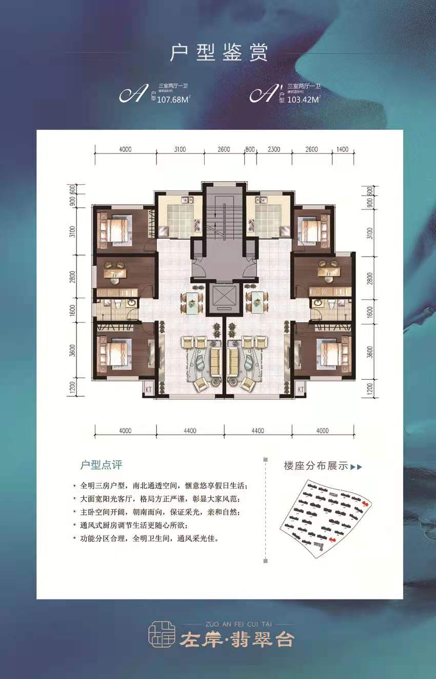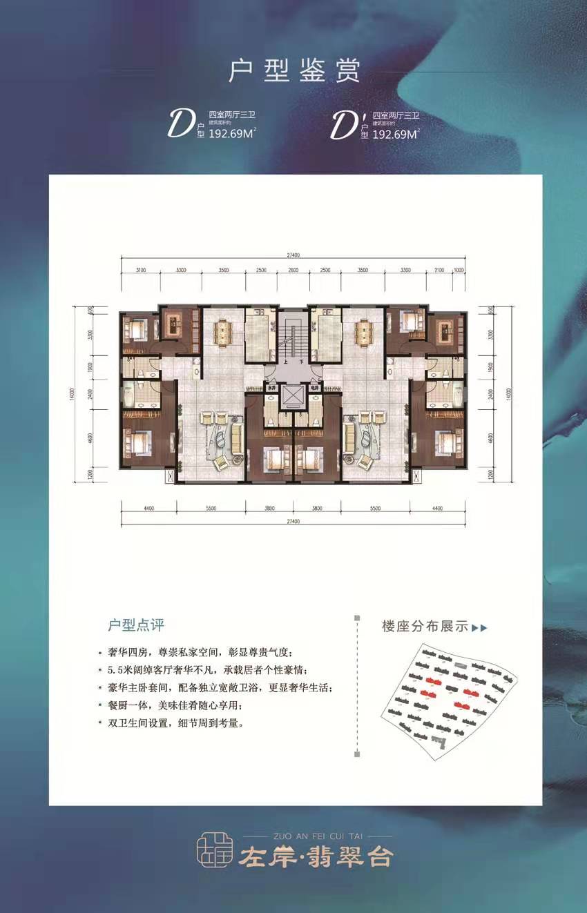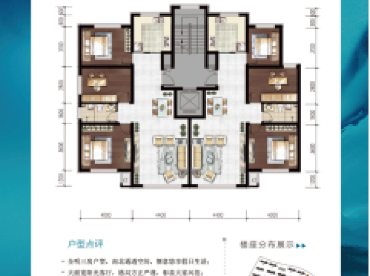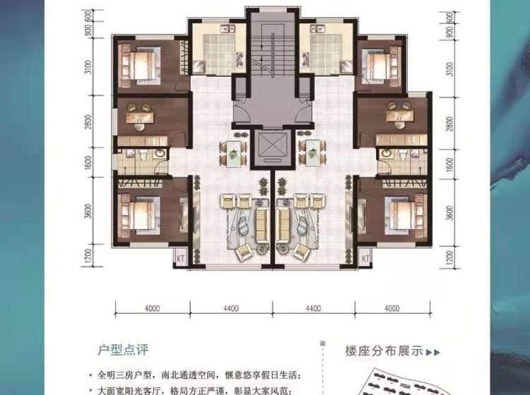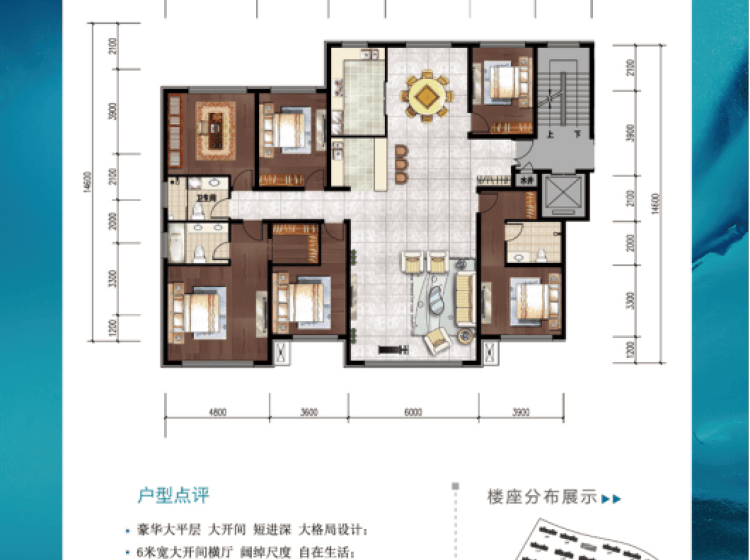 面积从102—300平米,全落地阳台保证充足的采光与视野;大开间、短进深,户型方正实用。