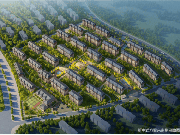 本案容积率仅1.09,全部为总高5、6层一梯两户的低密电梯洋房、绿化率高达38%,为周边项目较高。新中式建筑风格,顶部坡屋顶造型结合飞檐设计,高端大气。充分利用现有地势地貌布局两环两轴四庭三台地景观,规划有5000平米的中心广场,内部有25个景观节点。