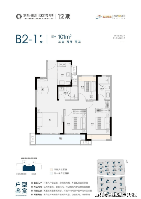 项目高层 建面约101㎡户型可以说是年轻人搞定丈母娘的实用性婚房户型,100㎡左右面积就能拿下一套宽绰的三房两厅两卫,双方父母来暂住也足够从容。