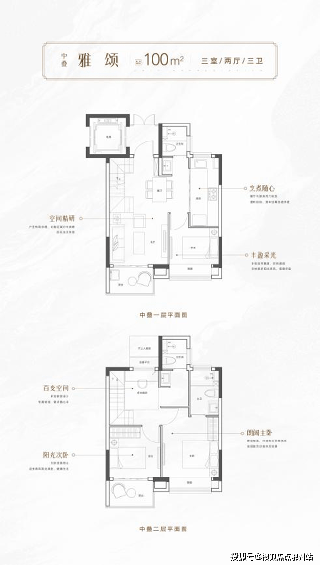 建面约100㎡玲珑叠墅,三房两厅两卫,卧室均朝南设计,精致花园,上下层动静分区,两层南向采光,打造通透的生活格局。