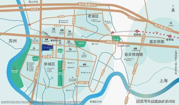 经济发达、产业雄厚、交通便捷,也同步提高了整个花桥的城市界面水平。以项目周边为例,大型商业、优质教育资源、医疗等生活配套齐全,还有多个生态公园环绕: