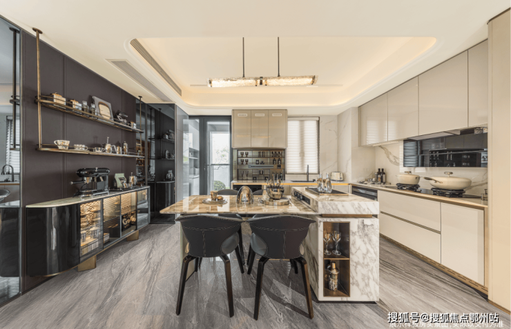 样板间还展示了另一种可能:打通厨房与次卧,形成 餐厨一体+中岛的社交空间,释放更大客厅尺度,为暂不需四房的年轻家庭提供灵活改造余地。