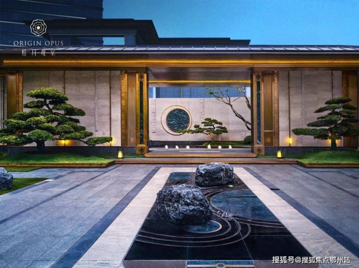 月影江南 灵韵入境:入户两侧水景清泉涌动,婉转迂回,一座精致的宋风美学馆展示在眼前。透过门框衬映出满月景墙,甄选名贵奢石,在虚实掩映间延续着东方诗意山水的写意画卷。
