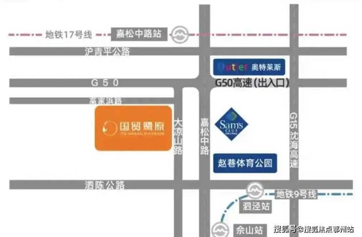 项目距离最近的地铁站是9号线佘山站,步行有一些距离,日常出行需依赖自驾。约2.5公里即达G50高速入口,临近嘉松中路、沈海高速、嘉闵高架路等主干道,可以快速直达虹桥商务区。