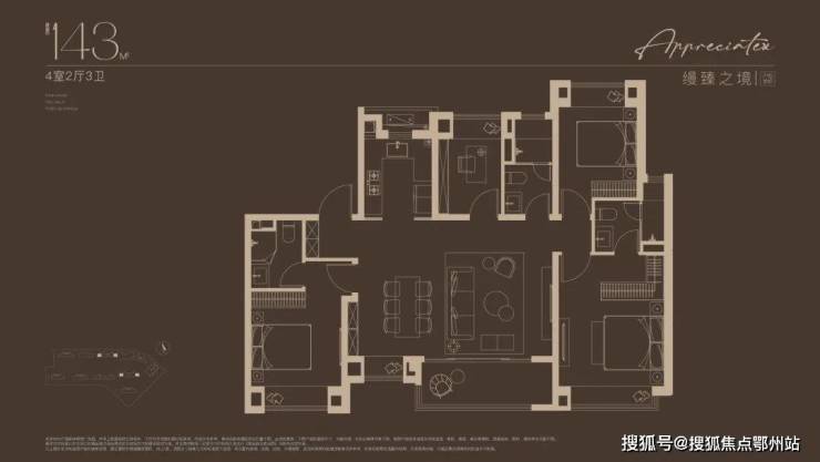 建面约143㎡四房设计,不论是三代同堂还是二娃家庭,都舒居无忧!2梯2户的设计, 极具私密性的入户门厅,彰显大宅归家礼序 。独立玄关,既是归家仪式感,更添收纳空间;约14米朝南面宽,搭配约7米尺度横厅,尽显大宅风范; 东西双套房设计,奢享全龄世家的静谧时光。