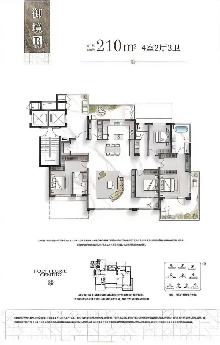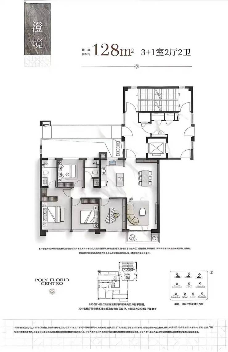 中间套128平做到了四开间朝南设计。电梯与隔壁的128平共用,且是两边对开门,这样一来,电梯厅就做到了私享,品质提升。