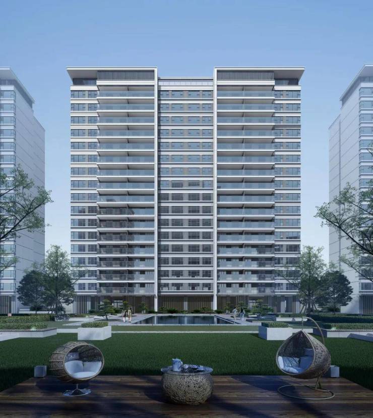 其立面选取现代简约风,高级灰色调搭配,大面积玻璃运用,园林引入温润森系的现代风格景观体系。